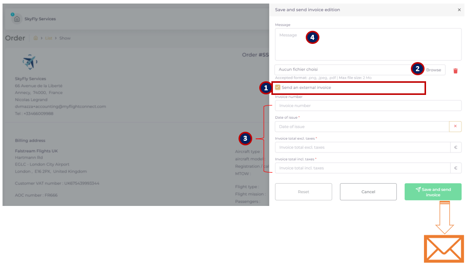 To convert the MyFlight Connect Order to Invoice, just prepare your personalized message and send without ticking the external invoice box.